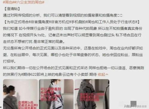 周也是一位有爱心的明星,她积极参与公益活动,传递正能量。在接受采访时,她表示:“我觉得,作为公众人物,我们有责任为社会做出贡献。”